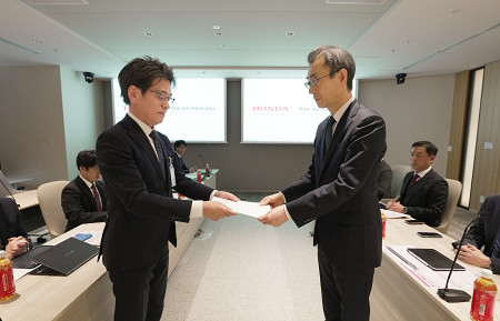 2026年春闘で、自動車大手の労働組合が18日、賃上げを求める要求書を経営側に相次いで提出した。写真はホンダの貝原典也副社長(右)に要求書を提出する同社労働組合の中央執行委員長=東京都港区(同社提供) 【時事通信社】